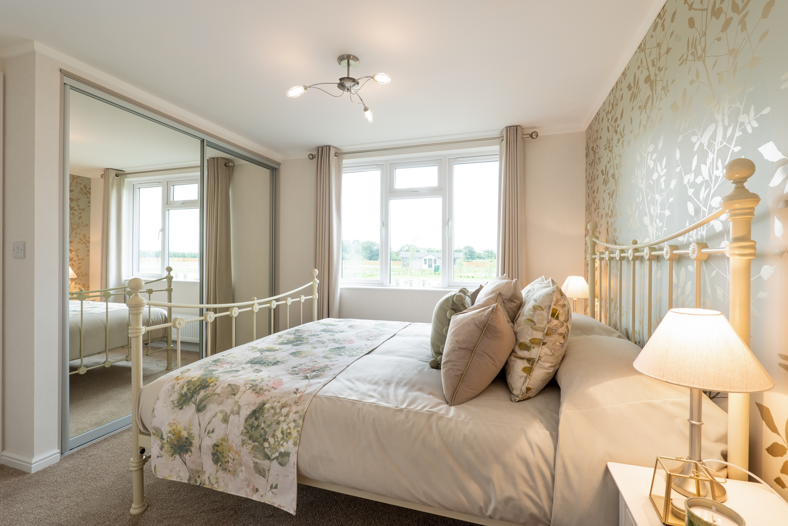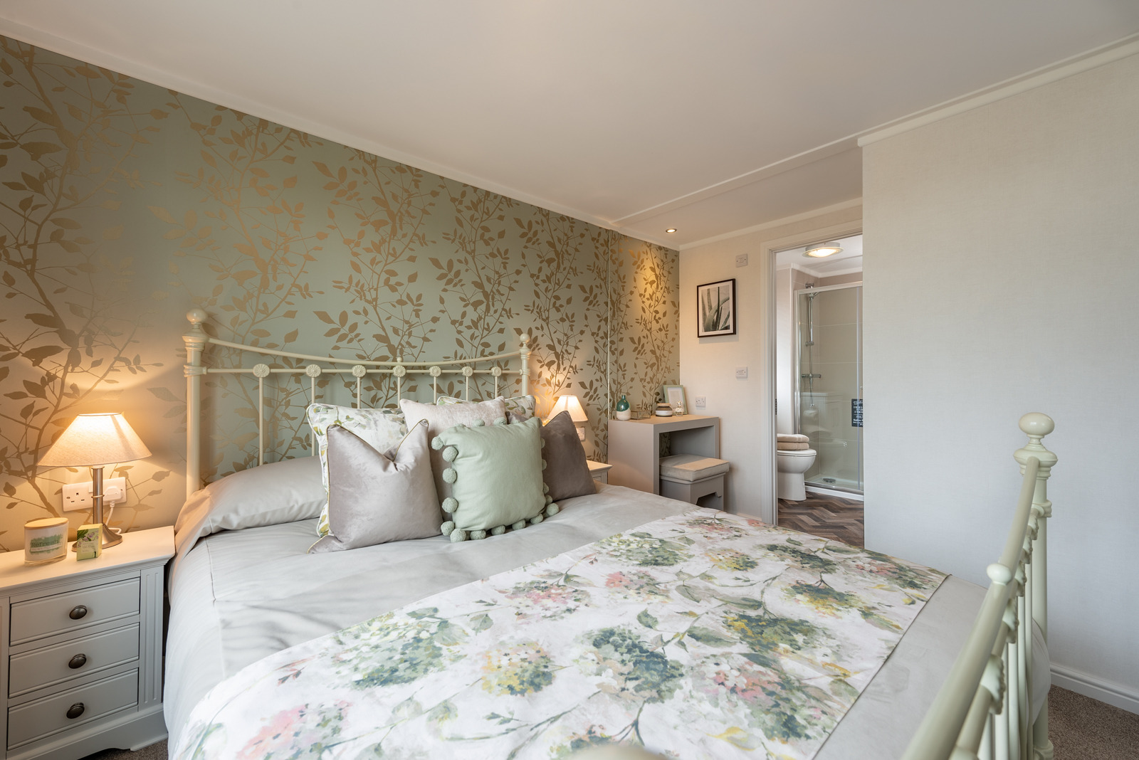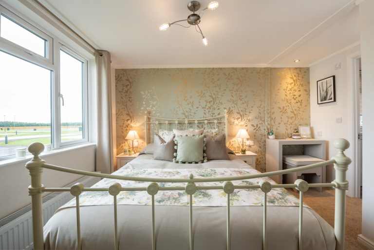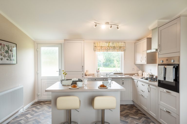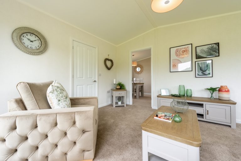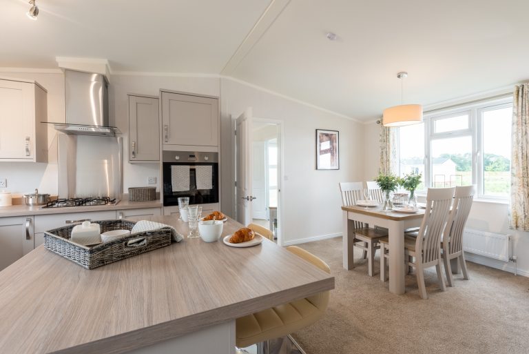 The interior of this residential park home is designed to impress too, from the plush velvet chaise sofa to the open plan kitchen and dining room. Both double bedrooms benefit from sliding mirror wardrobes and the master suite’s beautiful decor, enhanced with an en-suite bathroom, would feel at home in any 5-star hotel.
